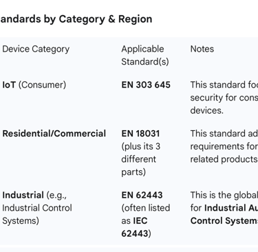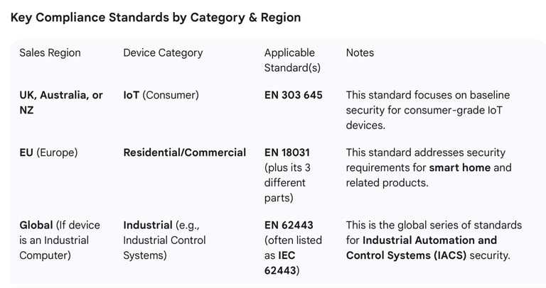 Cybersecurity compliance is a complex and evolving field. The standards listed above are starting points, and regional requirements (like the EU's Radio Equipment Directive - RED or the Cyber Resilience Act - CRA) often involve much more detail.